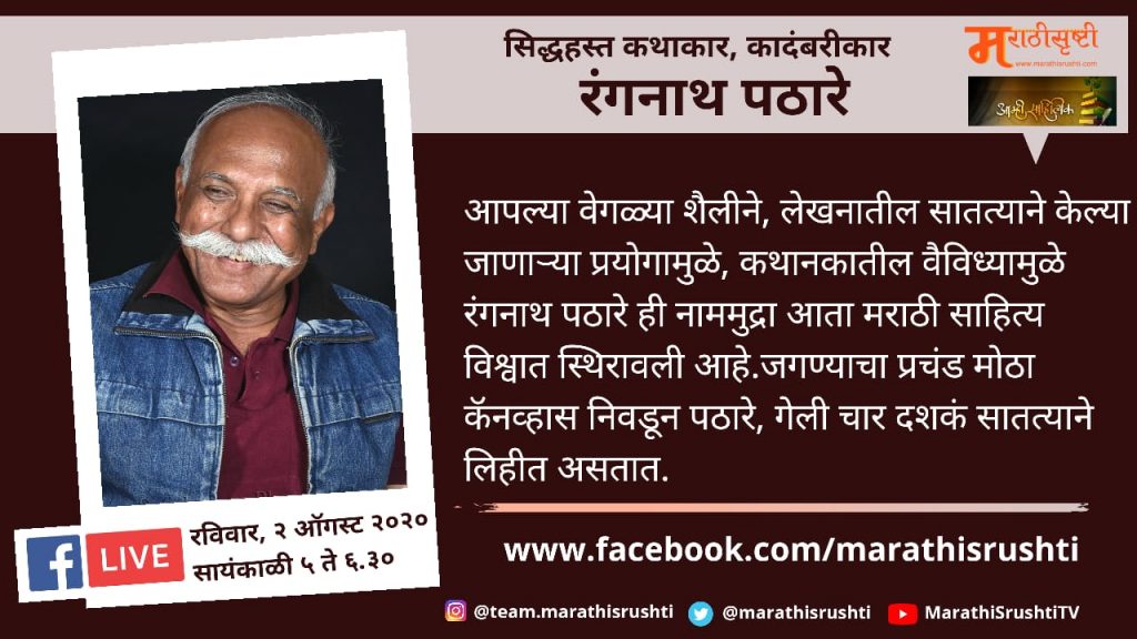 रविवार, २ ऑगस्ट २०२० रोजी सायंकाळी ५ ते ६.३० या दरम्यान रंगनाथ पठारे यांच्याशी संवाद साधणार आहेत डॉ नीतीन रिंढे.