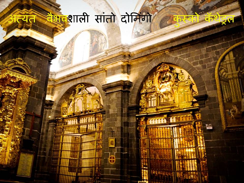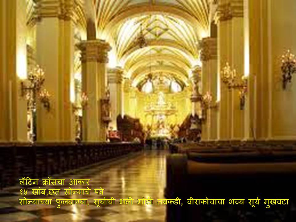 या कॅथेड्रलचा आकार लॅटिन क्रॉसचा आहे. त्याचा खूप लांब रुंद १४ खांबावर तोललेला गाभारा त्याचे तीन पांख (विंग) एकत्र येऊन झालेला आहे. खांब मोठे व कलात्मक आहेत. कोरीकांचामधून आणलेले सोन्याचे पत्रे या खांबांना, छताला सुशोभित करण्यासाठी वापरले आहेत. सूर्यमंदिरातील फुलदाण्या तशाच कॅथेड्रलमध्ये आणण्यात आल्या. सूर्याची भली मोठी तबकडी, वीराकोचाचा सुवर्णाचा भव्य सूर्य मुखवटा व इतर देवळातील सोने वापरून कॅथेड्रल सुवर्णमय बनवण्यात आलं.” एवढी माहिती ऐकून आम्ही कॅथेड्रलमधे गेलो अन……आमचे पाय तिथेच खिळून राहिले, नजरा विस्फारल्या. कोरीकांचामध्ये पहायला न मिळालेले सोने इथे दृष्टी दिपवत होते. जगातली अनेक चर्चेस आजपर्यंत पाहिली, पण इतके वैभवशाली व सोन्याने मढलेले चर्च प्रथमच पाहिले.