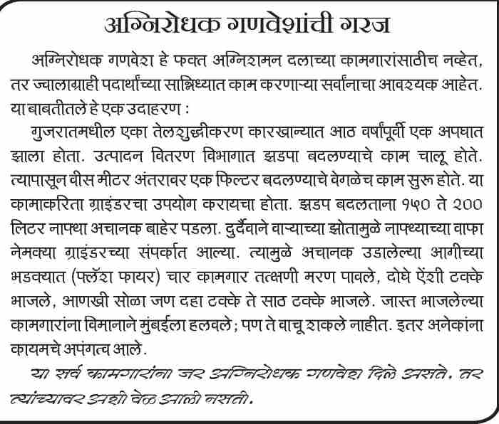 मुंबईत आगी लागण्याच्या अनेक घटना घडतात. अग्निशमन दलातील जवान आणि अधिकारी आपला जीव धोक्यात घालून या आगी विझवतात. या विझवताना अनेकदा अग्निशमन दलाचे जवान आणि अधिकारी जखमी तर होतातच पण काही वेळा तर त्यांना प्राणही गमवावे लागतात. ही जीवितहानी टाळायची असेल, तर अग्निशमन दलातील जवानांचे आणि अधिकाऱ्यांचे गणवेश हे परिपूर्ण असायलाच हवेत. अन्यथा, या घटना पुन: पुनः घडत राहतील आणि आगीशी झुंजणाऱ्या या योद्ध्यांचे हे बलिदान व्यर्थच ठरेल!