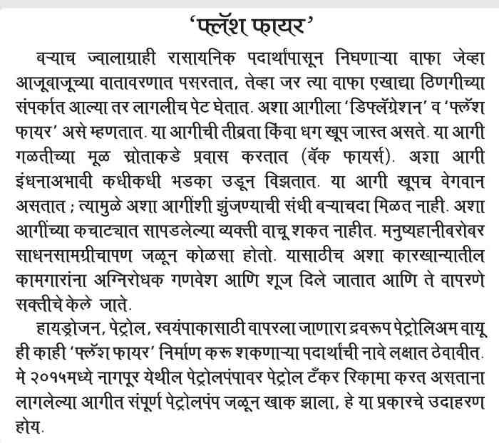 बऱ्याच ज्वालाग्राही रासायनिक पदार्थांपासून निघणाऱ्या वाफा जेव्हा आजूबाजूच्या वातावरणात पसरतात, तेव्हा जर त्या वाफा एखाद्या ठिणगीच्या संपर्कात आल्या तर लागलीच पेट घेतात. अशा आगीला ‘डिफ्लॅग्रेशन’ व ‘फ्लॅश फायर’ असे म्हणतात. या आगीची तीव्रता किंवा धग खूप जास्त असते. या आगी गळतीच्या मूळ स्रोताकडे प्रवास करतात (बॅक फायर्स). अशा आगी इंधनाअभावी कधीकधी भडका उडून विझतात. या आगी खूपच वेगवान असतात; त्यामुळे अशा आगींशी झुंजण्याची संधी बऱ्याचदा मिळत नाही. अशा आगींच्या कचाट्यात सापडलेल्या व्यक्ती वाचू शकत नाहीत. मनुष्यहानीबरोबर साधनसामग्रीचापण जळून कोळसा होतो. यासाठीच अशा कारखान्यातील कामगारांना अग्निरोधक गणवेश आणि शूज दिले जातात आणि ते वापरणे सक्तीचे केले जाते. हायड्रोजन, पेट्रोल, स्वयंपाकासाठी वापरला जाणारा द्रवरूप पेट्रोलिअम वायू ही काही ‘फ्लॅश फायर’ निर्माण करू शकणाऱ्या पदार्थांची नावे लक्षात ठेवावीत. मे २०१५ मध्ये नागपूर येथील पेट्रोलपंपावर पेट्रोल टँकर रिकामा करत असताना लागलेल्या आगीत संपूर्ण पेट्रोलपंप जळून खाक झाला, हे या प्रकारचे उदाहरण होय.