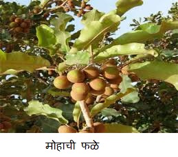 फळांचा उपयोग : जून-जुलैत मोहाची फळे पिकतात. फळे गोल असतात. फळात भरपूर रस असतो. फळे पिकल्यावर खाली पडतात. आदिवासी व खेड्यापाड्यातील लोक फळे गोळा करतात. फळे तशीच वा शिजवून त्याची भाजी करून खातात. फळातही भरपूर प्रमाणात साखर असते. अल्कोहोल प्रमाणही चांगले असते. एक टन फळांपासून ११० लिटर शुध्द अल्कोहोल मिळते. याशिवाय फळात तेल, इथिल, टर्पेंटाईन ओईल असते. सर्वात जास्त प्रमाणात ६७.९% अल्कोहोल असते.