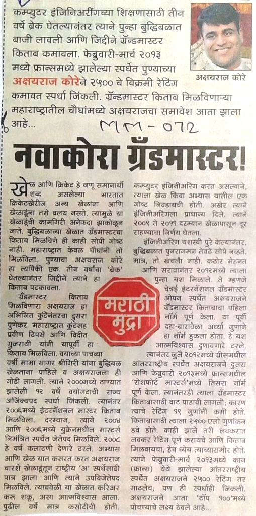 अक्षयराज कोरे यांच्याविषयी महाराष्ट्र टाईम्सच्या म.टा. नोंद या सदरात प्रकाशित झालेला नवाकोरा ग्रॅंडमास्टर हा लेख पुढील पानावर वाचा.