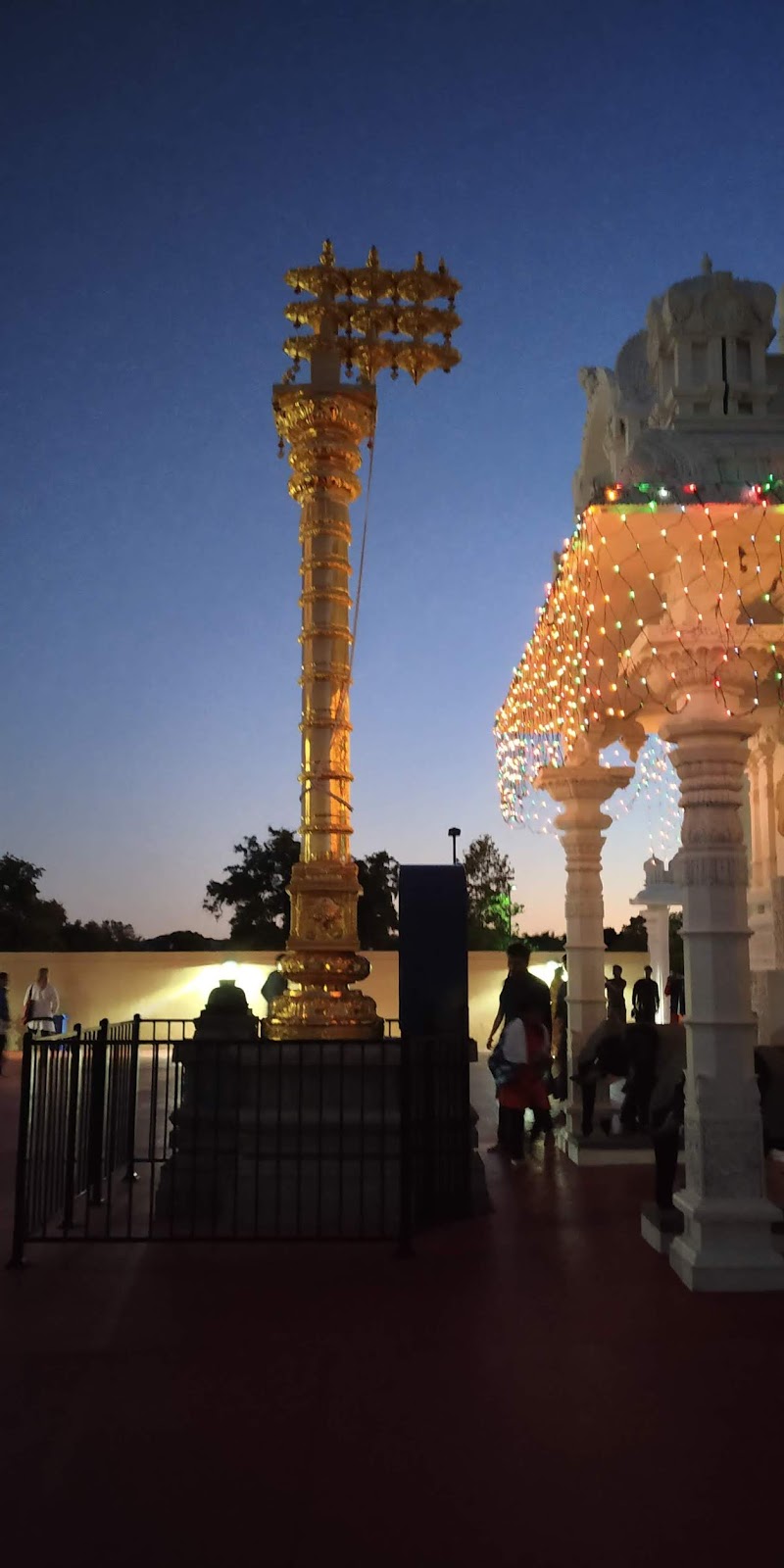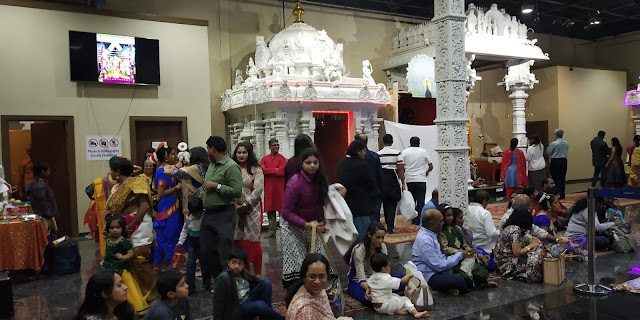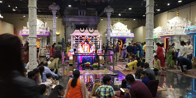 यावर उपाय म्हणून मुलाने आम्हाला उबर कॅब करून दिली. आणि तो कारने आला. जाण्यासाठी जो, दिवस आम्ही निवडला त्याला एक कारण हि होते. तेथे त्या वीकेंडला फेयरवेल, म्हणजे छोटीशी जत्रा, काही स्टॉल्स लाइटिंग वगैरे होते. लाइटिंग साठी आम्ही घरातून संध्याकाळी निघालो.मुलगा पोहचायला उशीर दिसत होता. आम्ही बूट,चप्पल काढून मंदिरात घुसलो. पहिले इम्प्रेशन झाले ते, या मंदिरात आपल्यीकडचा मंदिराची भव्यता (म्हणजे आपल्या हेमाडपंती देवळात असतो तो, एक गंभीर ‘रिचनेस’) आणि गलिच्छपणा येथे नाही. थोडक्यात सांगायचे ते मंदिर म्हणजे एक विशाल महागडा स्टुडिओ सेट असल्या सारखे वाटले. आपल्या मंदिरात पाऊल टाकले कि आपण (किमान मी तरी) किंचित अंतर्मुख होता, अगदी खेड्यातले गावाबाहेरचे मारोती मंदिर असले तरी! तसा फील येथे आला नाही. थोडं थांबा! म्हणजे हे मंदिर वाईट होते असे मुळीच नाही! अत्यंत सुरेख बांधणीचे होते. गाभाऱ्यात लाल गालिच्या पसरलेला होता. गाभारा खूप मोठा होता. आता विविध देवतांचे,जसे गणपती, महालक्ष्मी, देवी,याचे छोटी-छोटी मंदिर(-त्यांना मंदिर म्हणण्यापेक्षा देवघर म्हणता आले असते) भिंती लागत होती. सर्व देवतांना ताज्या फुलांची मनमोहक आरास! मध्यभागी बालाजीची सालंकृत माध्यम आकाराची मूर्ती, त्याभोवती लाईटिंगची नेत्रदीपक आरास होती. या सर्वात मिससिंग फक्त धूप/किंवा उदबत्तीचा घमघमाट! येथे, म्हणजे अमेरिकेतच आगीची खूप काळजी घेतली जातेय, असे दिसते. जळावू लोकांना, व्हिसापण, याच कारणामुळे मिळत नसावा, असे आता मला वाटायला लागले आहे!(असो. इतकं जळवण बर नव्हे!)