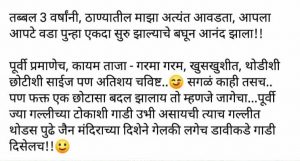 “अरे, आता इथे गाडी लावता का ? पूर्वी बाहेरच्या रस्त्यावर असायची ना त्यामुळे कळलंच नाही. आज इकडून आले म्हणून कळलं.” (पण आता त्यांची गाडी पूर्वीच्या जागीच आलेली आहे)