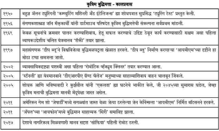 १९५० साली मांडलेली कृत्रिम बुद्धिमत्तेची संकल्पना आज प्रत्यक्षात आलेली दिसते. आपल्या हातातल्या भ्रमणध्वनीपासून ते मंगळावर जाणाऱ्या यानांपर्यंत आणि खेळ खेळणाऱ्या संगणकांपासून ते विनाचालक वाहनांपर्यंत आज सर्वत्र कृत्रिम बुद्धिमत्ता आपली अनिवार्यता पटवून देत आहे. विश्व व्यापून दशांगुळे उरणाऱ्या या कृत्रिम बुद्धिमत्तेचा इतिहास, प्रवास आणि भविष्याचा आढावा घेणारा हा लेख…