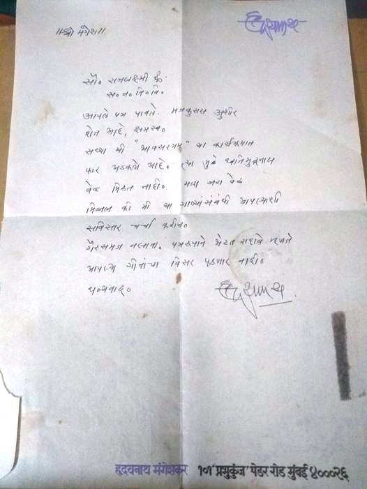 त्याला हृदयनाथांचे आलेले आत्मीय उत्तर म्हणजे वरील पत्र ! त्यांची अजिजीची भाषा, “क्षमस्व “वगैरे लिहिणे त्यांच्या उंचीनुसार असले तरी अप्रत्यक्षरीत्या आमच्या खुजेपणाकडेही बोट दाखविणारे होते. परत त्यांना पत्र लिहिण्याचे धाडस झाले नाही. पत्रावरील पोस्टाचा शिक्का आहे – १५/३/९३