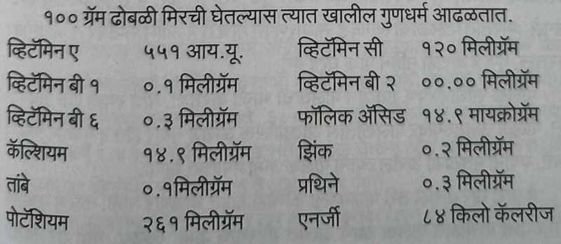 सिमला मिरचीमध्ये भरपूर चुना (कॅल्शियम) असते. मात्र ते शरीरात विरघळण्यात बराच वेळ जातो. सिमला मिरचीचा आवश्यक वापर करावा. त्यामुळे हाडांची वाढ चांगली होते. तसेच लहान मुलांना हाडे सडपातळ होऊन रक्त प्रवाह सुरळीत चालतो. लहान मुले अथवा मोठी माणसे यांना जर दातांचा त्रास अथवा रक्त येत असल्यास गाजर व सिमला मिरची घ्यावी त्वरित आराम मिळतो. तसेच मुत्राशयाचा त्रास होत असल्यास सिमला मिरची खूप फायदेशीर असते. तसेच सिमला मिरचीने श्वसनक्रियांचा त्रास त्वरित बरा होतो. नेहमीच अॅसिडीटी होत असल्यास सिमला मिरची न उकडता रस काढून तो अगदी लहान प्रमाणात द्यावा, आराम मिळतो. त्याचप्रमाणे बद्धकोष्ठता अथवा गर्भवती स्त्रिया यांना सिमला मिरचीचा वापर चांगल्यारितीने करणे आवश्यक आहे. सिमला मिरचीवर कीटकनाशक जंतू असतात. आणि या मिरच्या स्वच्छ करून त्याचा वापर करावा, नाहीतर शरीराला घातक ठरते. सिमला मिरचीचा आवश्यक उपयोग करावा.