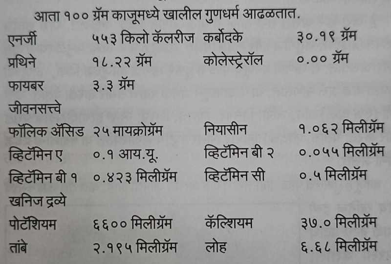 काजू हे नुसतेच फळ नाही तरी ते एक अत्यंत औषधी आहे. यात तंतू जीवनसत्त्वे तसेच खनिज द्रव्ये इत्यादी बरेच पदार्थ वापरता येतात. काजूमध्ये शक्ती प्रचंड असते.
