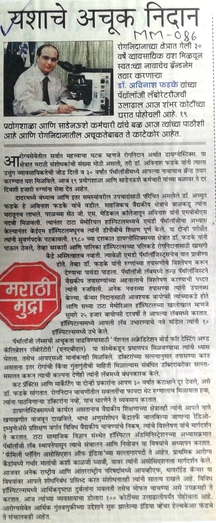 डॉ. अविनाश फडके यांच्याविषयी महाराष्ट्र टाईम्सच्या म.टा. नोंद या सदरात प्रकाशित झालेला यशाचे अचूक निदान हा लेख पुढील पानावर वाचा.