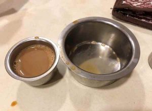 कधीतरी बाहेर गेल्यावर माटुंगाच्या मद्रास कॅफे मध्ये जाऊन त्यांची कॅाफी प्यायचा योग आला. घरात, घरगुती समारंभात, गाण्याच्या किंवा काही इतर समारंभात कॅाफी साठी तेव्हा कपबशीच वापरली जायची. पण मद्रास कॅफे मध्ये अशा मोठ्या वाटी(की पेला?)मधून प्यायला मिळाली.. कटींग पाहिजे तर दोघांना पिता येईल अशी…