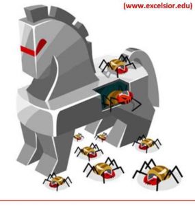 आणि त्या सैन्यानं ट्रॉय शहराचा ताबा घेतला. काही विषाणू अशाच पद्धतीनं वागतात म्हणून त्यांना ‘ट्रॉजन हॉर्स’ म्हणजे ‘ट्रॉयचा घोडा’ असं म्हणतात. ग्रीक सैनिकांप्रमाणे एखाद्या उपयोगी वाटणाऱ्या सॉफ्टवेअर-मध्ये किंवा एखाद्या संगणकीय खेळामध्ये लपून हे विषाणू संगणकात प्रवेश करतात आणि गुपचूप आपलं काम करतात.