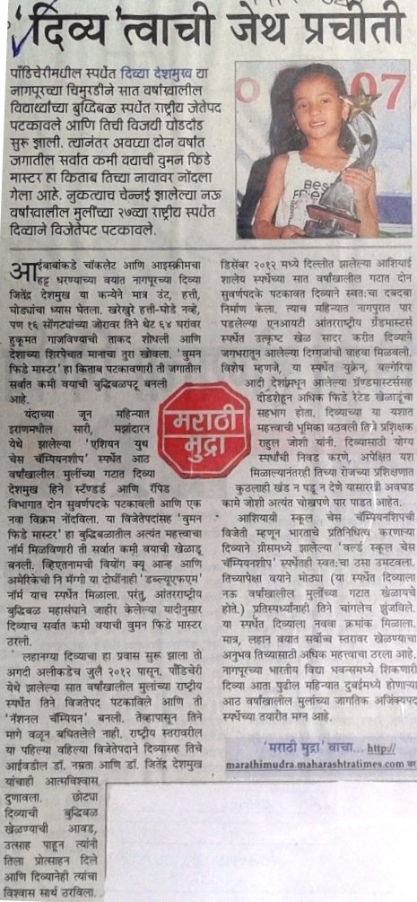 पॉंडेचरीमधील स्पर्धेत दिव्या देशमुख या नागपूरच्या चिमुरडीने सात वर्षांखालील विद्यार्थ्यांच्या बुद्धिबळ स्पर्धेत राष्ट्रीय जेतेपद पटकावले आणि तिची विजयी घोडदौड सुरु झाली. त्यानंतर अवघ्या दोन वर्षांत जगातील सर्वांत कमी वयाची वुमन फिडे मास्टर हा किताब तिच्या नावावर नोंदला गेला आहे. नुकत्याच चेन्नई येथे झालेल्या नऊ वर्षांखालील मुलींच्या २७ व्या राष्ट्रीय स्पर्धेत दिव्याने विजेतेपद पटकावले.