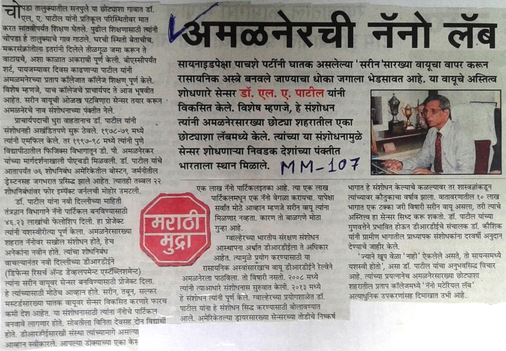 डॉ. एल.ए. पाटील यांच्याविषयी महाराष्ट्र टाईम्सच्या म.टा. नोंद या सदरात प्रकाशित झालेला अमळनेरची नॅनो लॅब हा लेख पुढील पानावर वाचा.