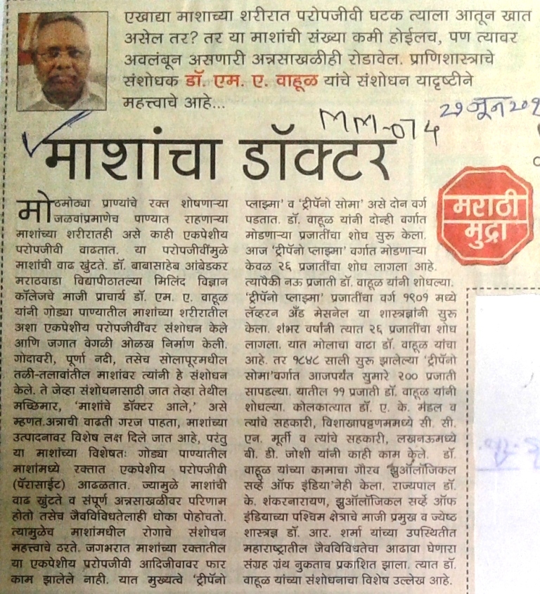 डॉ.एम.ए. वाहूळ यांच्याविषयी महाराष्ट्र टाईम्सच्या म.टा. नोंद या सदरात प्रकाशित झालेला माशांचा डॉक्टर हा लेख पुढील पानावर वाचा.