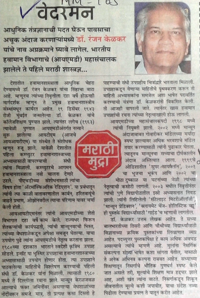 डॉ. रंजन केळकर यांच्याविषयी महाराष्ट्र टाईम्सच्या म.टा. नोंद या सदरात प्रकाशित झालेला वेदरमन हा लेख पुढील पानावर वाचा.