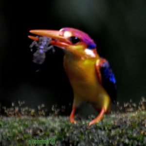 २०२०च्या सप्टेंबरमध्ये भर पावसात फार्म जवळच राहणाऱ्या , विविध दुर्मिळ पक्ष्यांच्या अधिवासाची आणि सवयींची भरपूर माहिती असलेल्या समाधान पवार या तरूणाबरोबर कर्नाळ्याचे जंगल तुडवत ,निसरड्या वाटांवरून तोल आणि पाण्यापासून कॅमेरा सावरत या पक्षाच्या घरट्यासमोर पोचलो. याचे घरटे मातीचा उभा बंधारा किंवा डोंगराच्या उभ्या उतारावर बिळात असते. कॅमेरा तयार ठेऊन अडोशामागून निसर्गाच्या या अतिसुंदर कलाकृतीची वाट पाहत होतो. काही क्षणातच तोंडात पिल्लांसाठी भक्ष्य घेऊन ही नीळी पिवळी ज्योत समोर ठाकली. पोझ दिल्यासारखी थांबून सूर मारून एका क्षणात बिळात गडप झाली आणि काही सेकंदात पुन्हा वेगात बाहेर पडली.