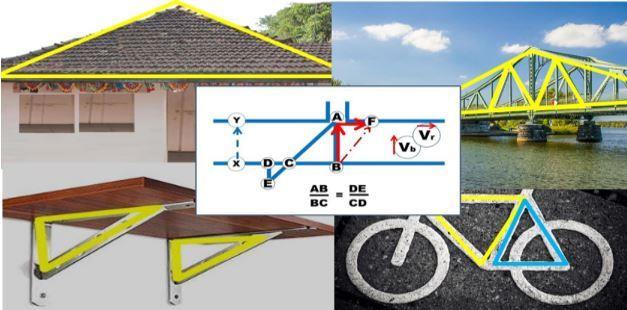 घरात सुद्धा भिंतीवर रॅक लावता तेव्हा त्याला खाली तिरका आधार असतो. अशा त्रिकोणी आधार देणाऱ्या बांधणीला “ट्रस (Truss)” म्हणतात. इतका प्रचंड उपयोग आहे, त्यामुळे आम्हाला त्रिकोण आकाराचे आकर्षण आणि आदर आहे आणि हे तुम्हाला सर्वत्र दिसेल. इथे प्रत्येक बांधकामात, रस्त्यांच्या आखणी मधे, त्रिकोणाच्या एक तरी प्रमेय स्पष्टपणे दिसेल अशी अपेक्षा असते…