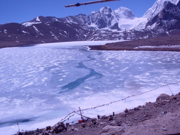 पुढील २० किमी. प्रवास आमची सर्वांची अळी मिळी गुप् चिळी, गाडीच्या काचा बंद, वर शुभ्र निळे आकाश, दुरवर दिसणारा मिनि कैलास बर्फाचा डोंगर पायथ्याशी खुरटे गवत चरणारे,काळे, कबर्या रंगाचे याक, प्रवासात आमची एकमेव गाडी, वातावरणातील भन्नाट सन्नाटा, १७८०० फूट उंचीचा दगड दिसला, गाडीने वळण घेतले आणि समोर बर्फाचा पसरलेला समुद्र व त्याच्या मध्यात चिंचोळा स्वच्छ निळ्या पाण्याचा ओहोळ, भ्रर दुपारच्या १ वाजताच्या उन्हात चकाकत होता. त्या पाण्यापर्यंत पोहचण्यास बर्फाच्या पायऱ्या.