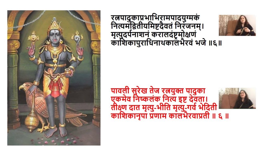 मराठी- ज्याची दोन्ही पावले रत्नजडित पादुकांच्या तेजाने सुंदर दिसत आहेत, जो अनादि अनंत एकमेव असा निष्कलंक देव आहे जो मृत्यूचा अहंकाराचा व अभिमानाचा नाश करतो आणि जो आपल्या भयानक दातांनी या भीतीपासून मुक्तता देतो, जो काशी नगरीचा अधिपती आहे, अशा कालभैरवाची मी आराधना करतो.