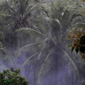 दिवसाच्या पहिल्या उजेडाने , दंवाने ओल्या झाल्यामुळे झळाळी आलेल्या माडांच्या झावळ्या. त्यातून वर वर जात असलेला निळसर धूर. आकाश बऱ्यापैकी उजळले असले तरी अजून सूर्याची किरणे झाडा झाडातून झिरपायला थोडा अवकाश आहे.