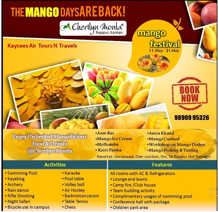 पुण्यातील केसीज एअर टुर्स आणि ट्रॅव्हल्स ( Kaycees Air Tours N Travels ) च्या मदतीने लवकरात लवकर बुकींग करुन रत्नागिरीमधील Cherilyn Monta ह्या Resort ला भेट द्या आणि आपल्या सगळ्यांच्याच आवडत्या आंबा महोत्सवाचा आनंद घ्या.