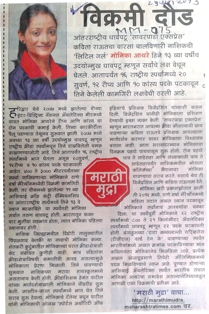 मोनिका आयरे यांच्याविषयी महाराष्ट्र टाईम्सच्या म.टा. नोंद या सदरात प्रकाशित झालेला विक्रमी दौड हा लेख पुढील पानावर वाचा.