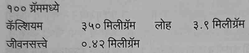 यातील कार्बोहायड्रेट जवळजवळ ८० टक्केपर्यंत असते. तसेच प्रथिने व खनिज पदार्थही जवळजवळ १०० टक्के असते. शेतकऱ्याची शक्ती जवळजवळ ३३६ किलो कॅलरीज असतात. म्हणजे हा शेतकरी सतत काम करून थकत नाही व सदैव उद्योगी असतो. यात कॅल्शियम हा एक महत्त्वाचा घटक आहे. ३५० मिलीग्रॅम इतके कॅल्शियम यात आहे. एवढे कॅल्शियम असलेले धान्य क्वचितच मिळते.