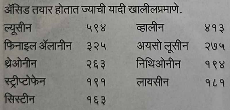 सर्व प्रथिनांचा प्रमुख उद्देश म्हणजे स्नायू बळकट करणे. शास्त्रज्ञांनी संशोधनानंतर गहू, तांदुळ, नाचणी, मका यांचा एक तक्ता बनविला तो याप्रमाणे.-