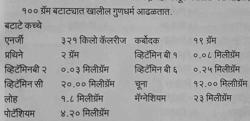 बटाट्याचा प्रसार सर्वत्र सुरू झाल्यामुळे त्यात अनंत प्रकार उदयास आले. सर्व जगामध्ये बटाट्याचे चीप्स करून ते तळून खाणे फारच लोकप्रिय आहे. भारतामध्ये बटाट्यात प्रचंड क्रांती झाली. आता प्रत्येकाच्या घरात बटाटा आढळतोच. अतिशय महत्त्वाचे समीकरण असते आणि अतिशय महत्त्वाचे म्हणजे बटाटा भारतामध्ये अगदी कन्याकुमारी ते काश्मीरपर्यंत मिळतो. बटाट्याची भाजी, सामोसे, भजी, बटाटे वडा असे अनेक प्रकार इतर पदार्थ बरोबर खाता येतात. तसेच दक्षिणमध्ये मसाला डोसा, पराठा असे अन्य प्रकार करता येतात. अशा प्रकारे बटाटा हे एक अभूतपूर्व अन्न आहे, हे विशेष, १०० ग्रॅम बटाट्यात दोन्ही प्रकार येतात. एक म्हणजे साल नसलेले तर दुसरे म्हणजे सालासकट. हे गुणधर्म खालीलप्रमाणे