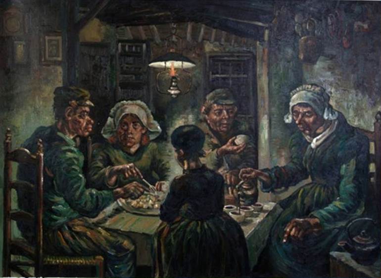 या शेतकऱ्यांना त्याचा विषयी अतिशय आदर वाटत असे. ज्या हातानी ते शेतात राबले, त्याच हातांनी आपण उत्पादित केलेले बटाटे ते ताटात ठेवलेले बटाटे सोलून खात होते. अत्यंत प्रामाणिक अशा प्रकारचा हा त्यांचा उदरनिर्वाह ! त्यामुळे या “न सोललेल्या “ बटाट्यांच्या रंग त्याने या चित्रासाठी वापरला आहे. प्रथम तो जवळ जाऊन चित्र काढीत असे, परंतु सहकलाकारांनी दिलेला सल्ला लक्षात घेऊन मनोमनी रुजलेले कल्पना-चित्र त्याने काढण्यास सुरुवात केली. यावेळी टेबलावर पसरलेले मळकट कापड, धुरकटलेल्या भिंती, ओबडधोबड तुळ्यांवर ‘टांगलेला दिवा’, बटाटे खाणाऱ्या स्त्रियांचे आणि पुरुषांचे हात आणि त्यांच्या चेहऱ्यावरील भाव या सर्व गोष्टींचा विचार करून त्याने ते चित्र रंगवले. अति शारीरिक श्रमामुळे त्यांचे खडबडीत चेहरे चित्रित करण्यासाठी गडद मातकट रंगाचा मुद्दाम वापर केला आहे. ते जसे होते तसेच ‘त्यांना’ चित्रित करावयाचे होते. कामकरी माणसाच्या आयुष्यातला आनंद, दुःख, चित्रात उमटले पाहिजे म्हणून विश्वाच्या लयीचे चित्रण त्याला करावयाचे होते. चित्र मनासारखे होईपर्यंत काम करीत राहायचे हेच त्याचे ध्येय . तेवढी चिकाटी त्याच्याजवळ निश्चितच होती आणि म्हणूनच एखाद्या पिसाटासारखा तो काम करत होता