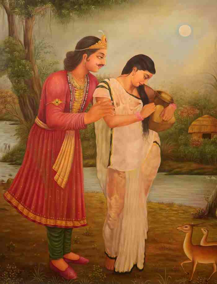 शिकारीला आलेला राजा चुकून कण्व ऋषींच्या आश्रमाभोवतीच्या उपवनांत पोंचलेला असतो.