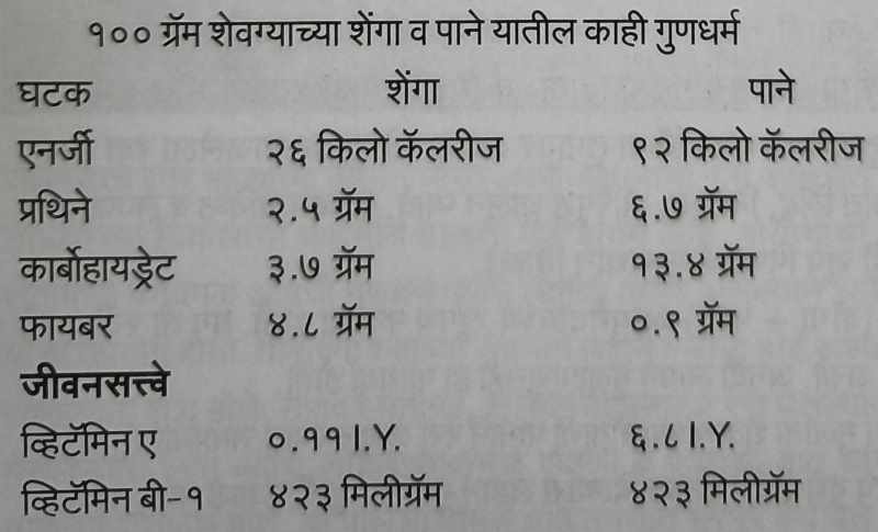 १०० ग्रॅम शेवग्याच्या शेंगा व पाने यातील काही गुणधर्म