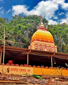 मंदिराचे मध्यभागी शिखर असलेले सिमेंट काँक्रिटचे छत उतरत्या धाटणीचे चौपाखी आणि वर कौलारू आहे. येथील शिखर आयताकृती आहे. खालील दोन फूट भाग अधिक रुंद असून त्यावर वरच्या बाजूस कमळ पाकळ्यांची नक्षी आहेत. त्यावरील सुमारे चार फूट उंच भागावर बारा कोष्टके व त्यात बारा ज्योतिर्लिंगाची शिल्पे आहेत. वरील भागावर कमळ फुलांची नक्षी व घुमट आहे. घुमटाचा वरचा भाग कमळ फुलाच्या नक्षीने सुशोभित आहे. घुमटाच्या वर एकावर एक असे दोन आमलक व त्यावर उंच कळस आहे.