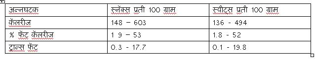 जेव्हा ह्या पदार्थांचे पृथक्करण केले तेव्हा हे पदार्थ कॅलरीज मध्ये जास्त आहेत असे निदर्शनास आले.खाली दिलेल्या तक्त्या वरून हे तुमच्या लक्षात येईल.