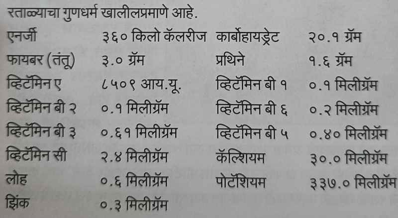 १०० ग्रॅम रताळ्याचा गुणधर्म खालीलप्रमाणे आहे.